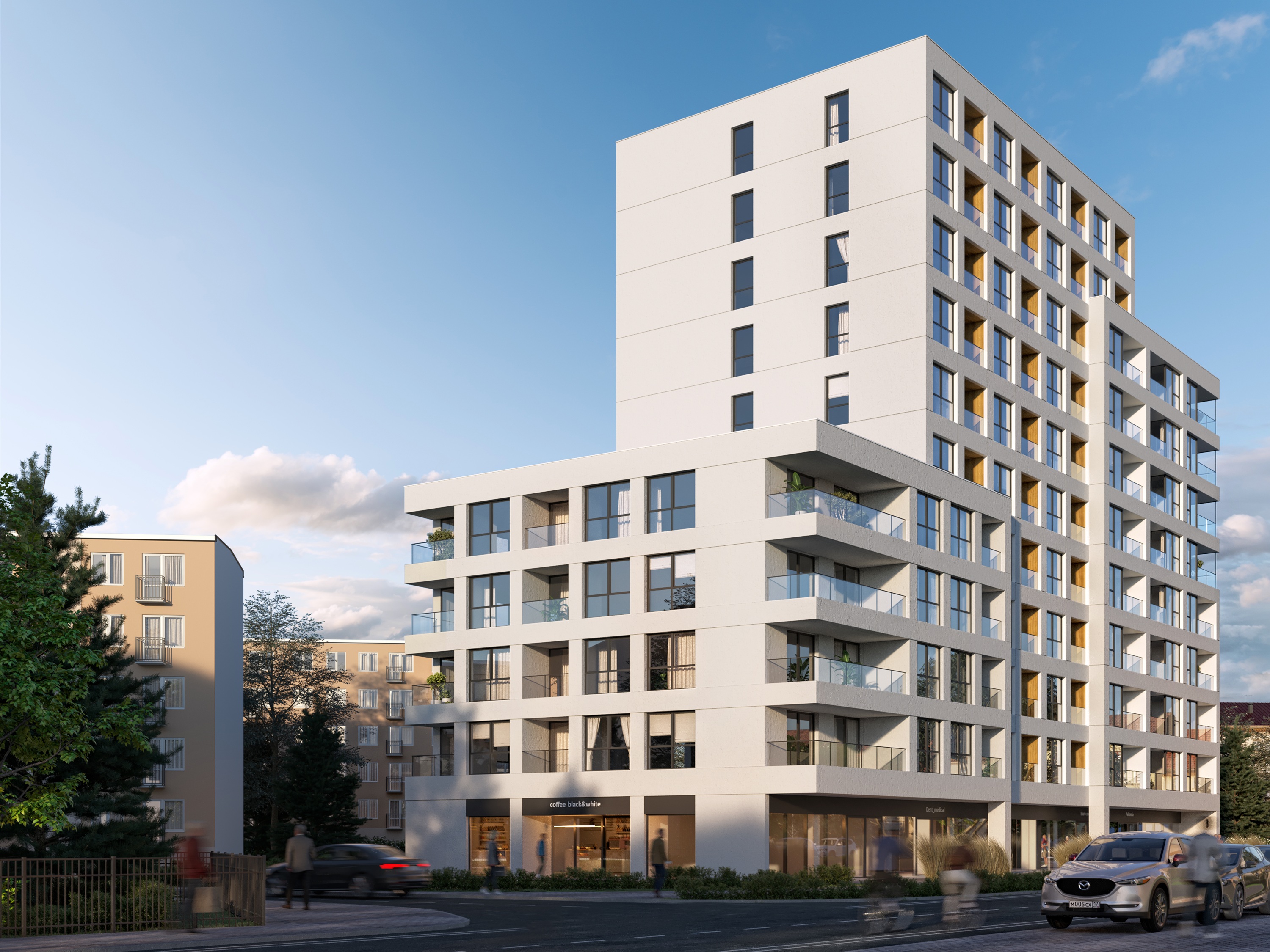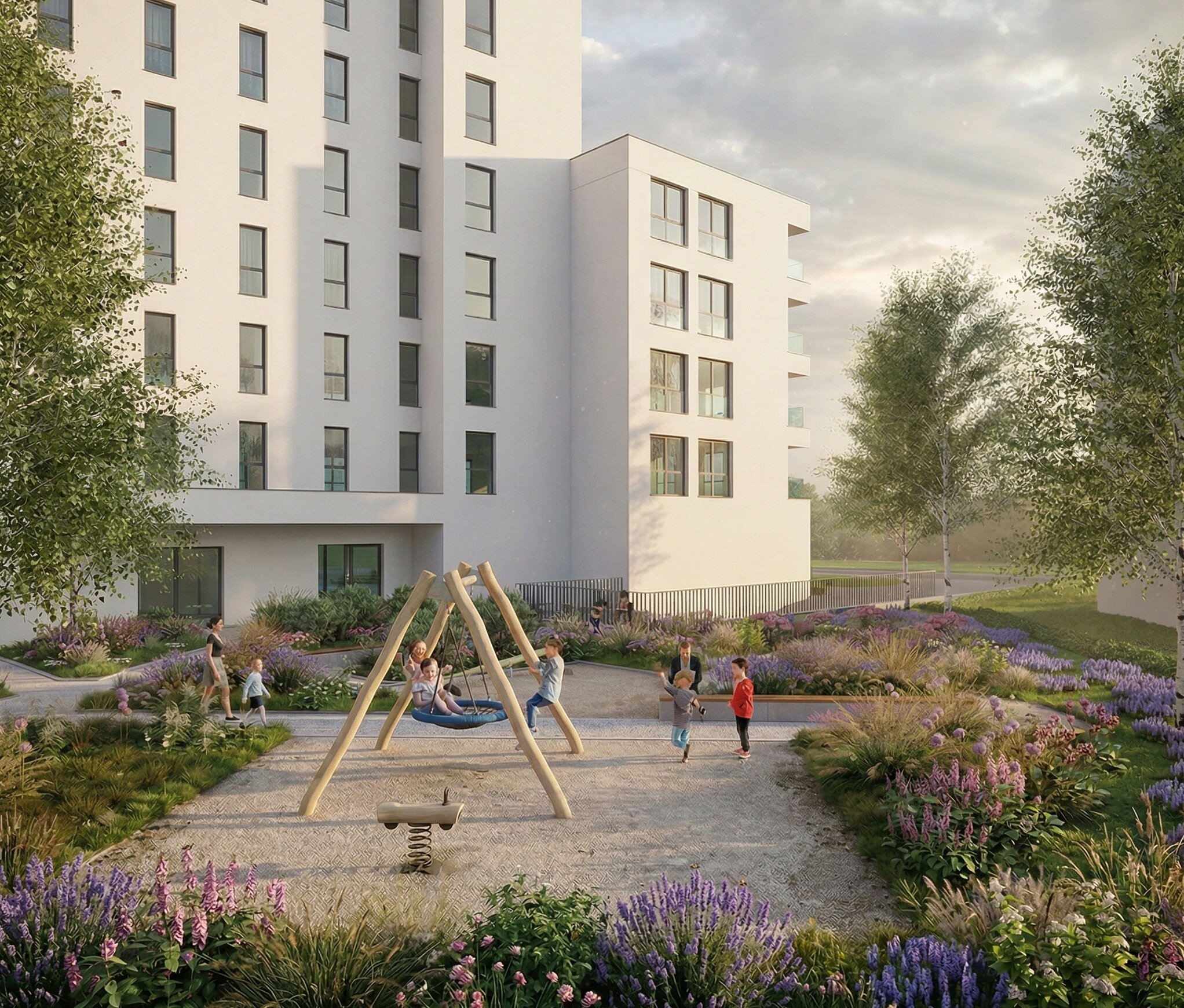 Nowoczesna architektura, wysokie kondygnacje i duże przeszklenia zapewniają jasne, funkcjonalne wnętrza, dopasowane do potrzeb rodzin na różnych etapach życia.